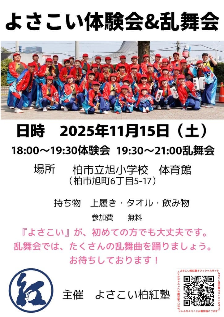 「よさこい体験会&乱舞会」を開催します。 体験会 よさこいイベントで、乱舞・総踊りとして踊られている楽曲の中から、簡単な曲のレクチャーを受けながら楽しんで頂きたいと思います。 今回は初心者向けの体験会です。 乱舞会 乱舞曲・総踊り曲をひたすら踊ります。 既に、チームに所属している方も参加OKです。 ![]() よさこいに興味や関心のある方、一度鳴子を鳴らしてみたいと思う方 この機会に是非参加してください。 | |
