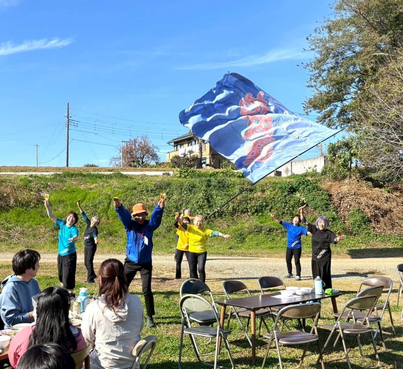 演舞の前に農園の皆さんにBBQをふるまっていただいて豚汁や焼きそばやホットドッグ、焼き芋などなど。